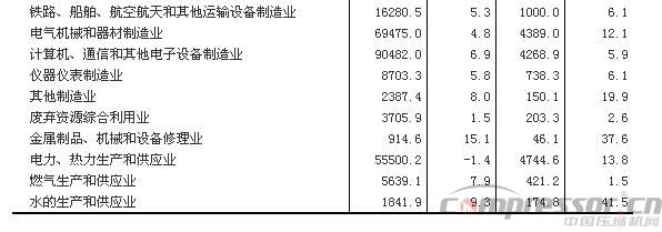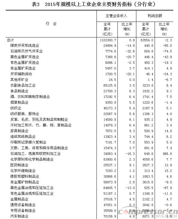 2015年,在41个工业大类行业中,29个行业利润总额比上年增长,12个行业下降。主要行业利润增长情况:农副食品加工业利润总额比上年增长6.4%,纺织业增长5.1%,石油加工、炼焦和核燃料加工业增长9.7倍,化学原料和化学制品制造业增长7.7%,汽车制造业增长1.5%,电气机械和器材制造业增长12.1%,计算机、通信和其他电子设备制造业增长5.9%,电力、热力生产和供应业增长13.8%,煤炭开采和洗选业下降65%,石油和天然气开采业下降74.5%,非金属矿物制品业下降9%,黑色金属冶炼和压延加工业下降67.9%,有色金属冶炼和压延加工业下降11%,通用设备制造业下降0.6%,专用设备制造业下降3.4%。