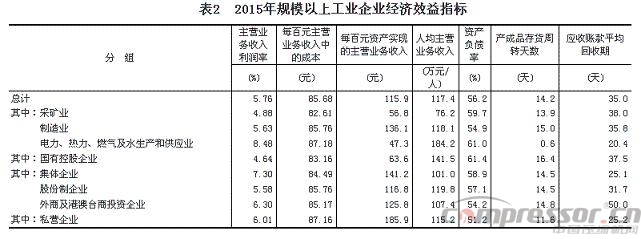2015年,规模以上工业企业主营业务收入利润率为5.76%,每百元主营业务收入中的成本为85.68元,每百元资产实现的主营业务收入为115.9元,人均主营业务收入为117.4万元,产成品存货周转天数为14.2天,应收账款平均回收期为35天。2015年末,资产负债率为56.2%。